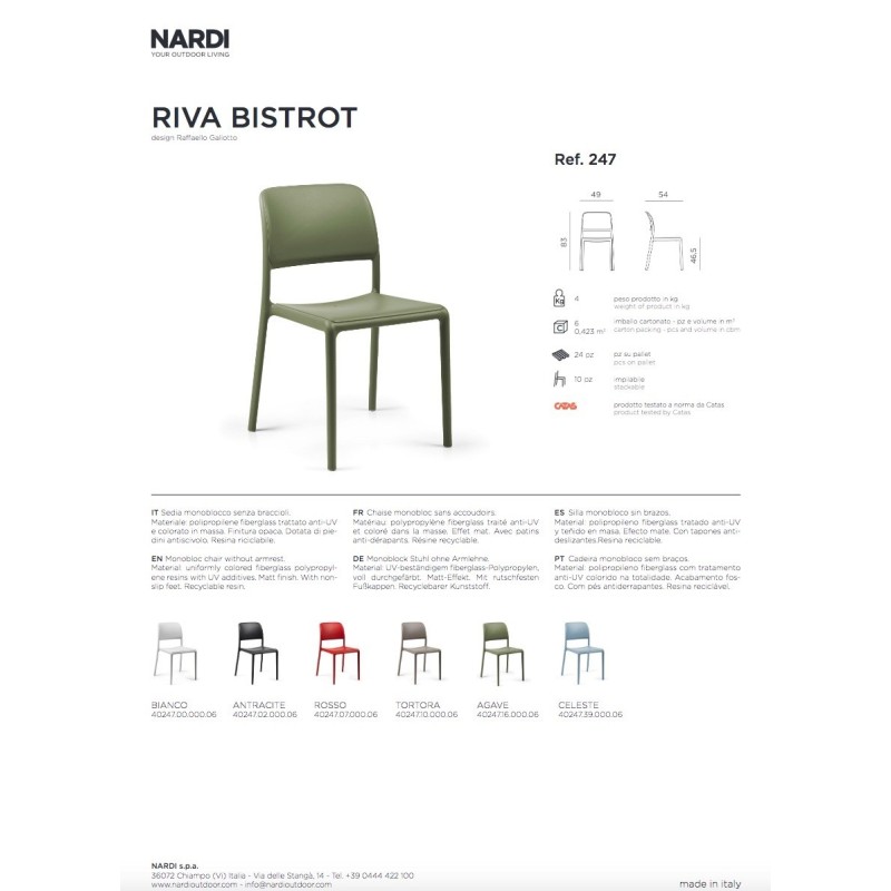 La sedia Riva Bistrot prodotta da Nardi Outdoor è una seduta monoblocco senza braccioli progettata dal designer Raffaello Galiotto, pensata per l’arredo di spazi esterni e interni come giardini, terrazze, balconi, bar e ristoranti. Il suo design è caratterizzato da linee semplici ed eleganti che uniscono funzionalità e stile contemporaneo, rendendola facilmente integrabile in diversi contesti di arredo, sia residenziali sia contract.