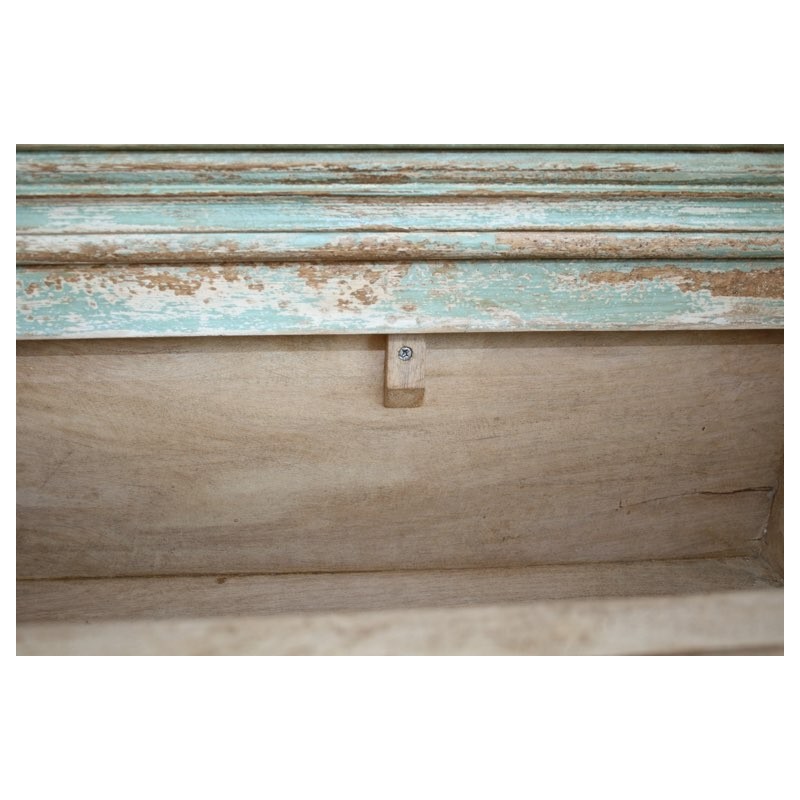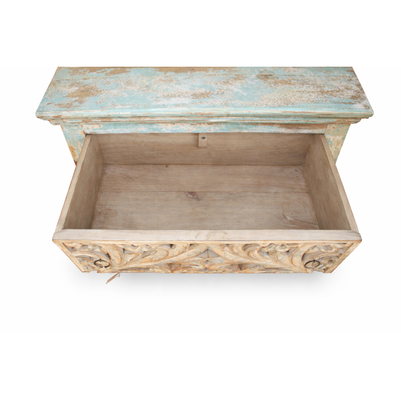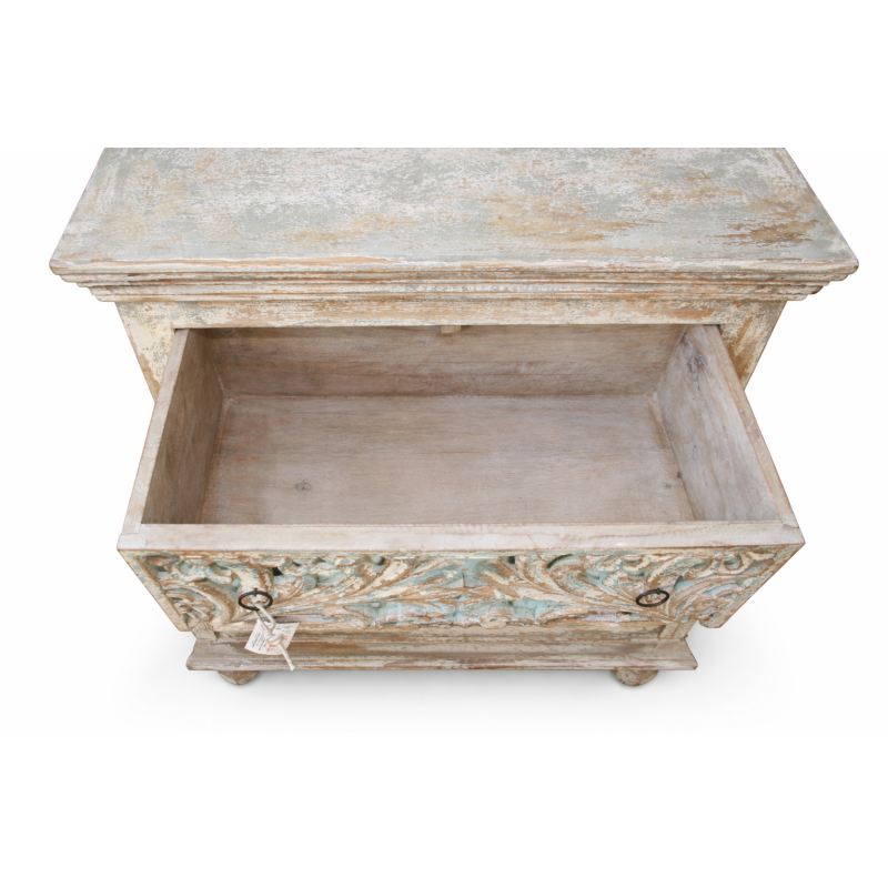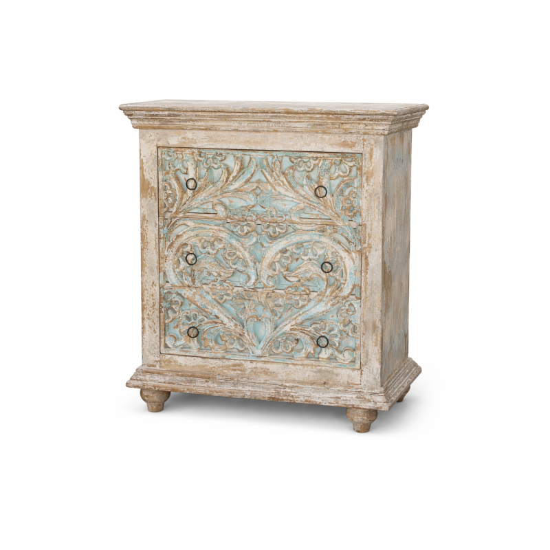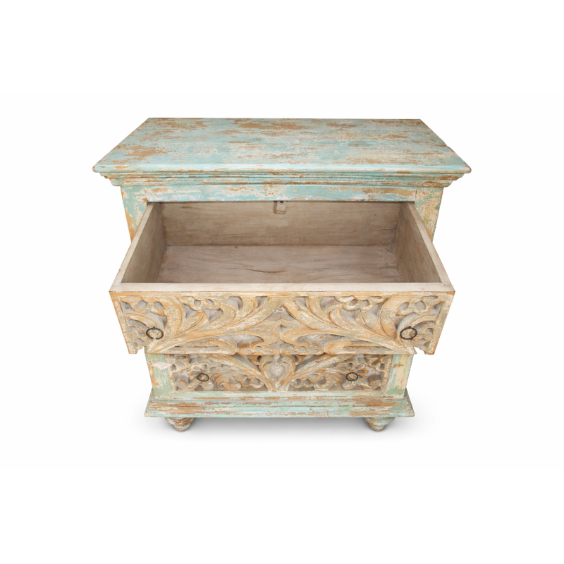 Cimò etnico artigianale proveniente dall’India, modello Calais, realizzato interamente in massello di legno di mango. Caratterizzato da raffinati intagli floreali eseguiti a mano e finitura decapata, è disponibile in due varianti colore: telaio grigio chiaro con cassetti azzurro chiaro oppure telaio azzurro chiaro con cassetti grigio chiaro.