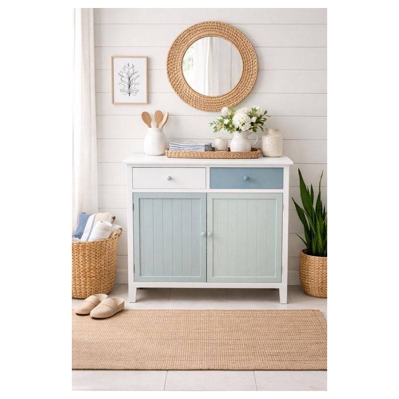 Le ante sono dotate di telaio in legno, mentre le pannellature interne e il piano superiore sono in MDF, garantendo stabilità strutturale e una superficie uniforme e resistente, la mensola interna non è rimovibile. Le dimensioni compatte (L 90 x P 40 x H 90 cm) la rendono perfetta per ingressi, soggiorni, cucine o spazi contract.