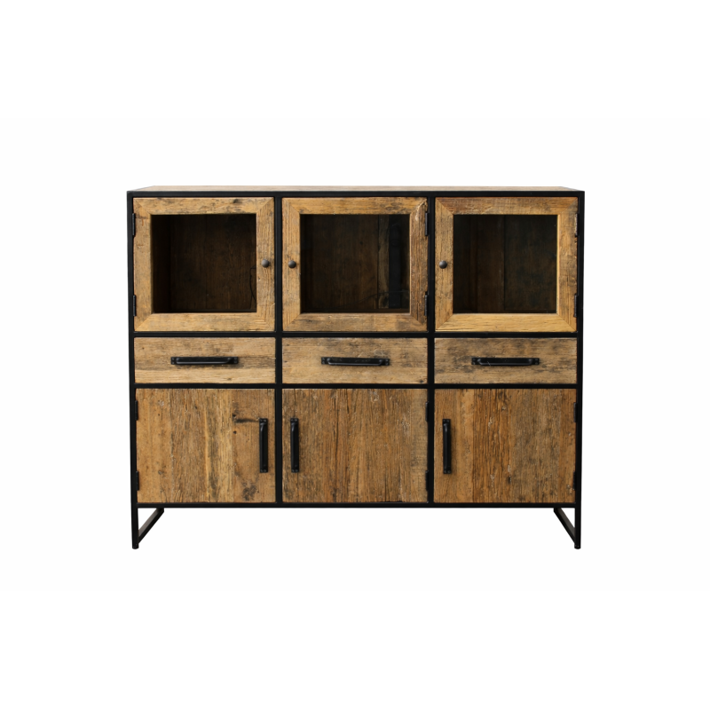 Credenza dallo stile industrial autentico modello Calgary 6 ante e 3 cassetti, caratterizzata da una struttura in metallo verniciato nero e frontali in legno massello dall’effetto vissuto. Il design combina solidità strutturale e matericità naturale, rendendola ideale per ambienti contemporanei, loft urbani e spazi dal carattere deciso.