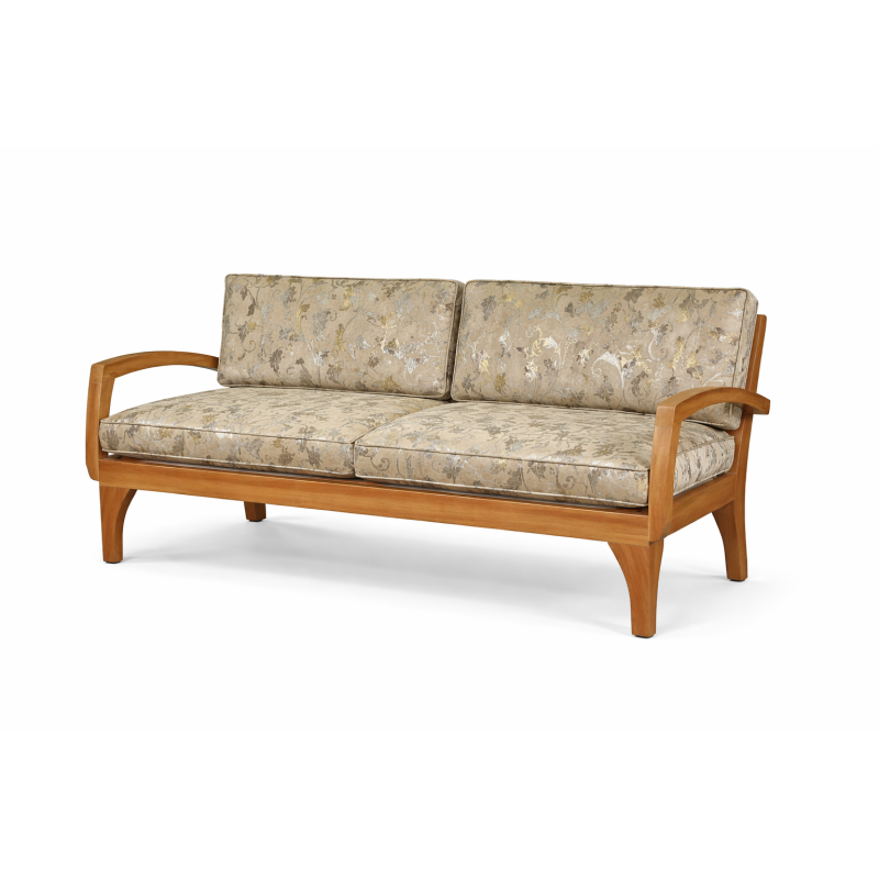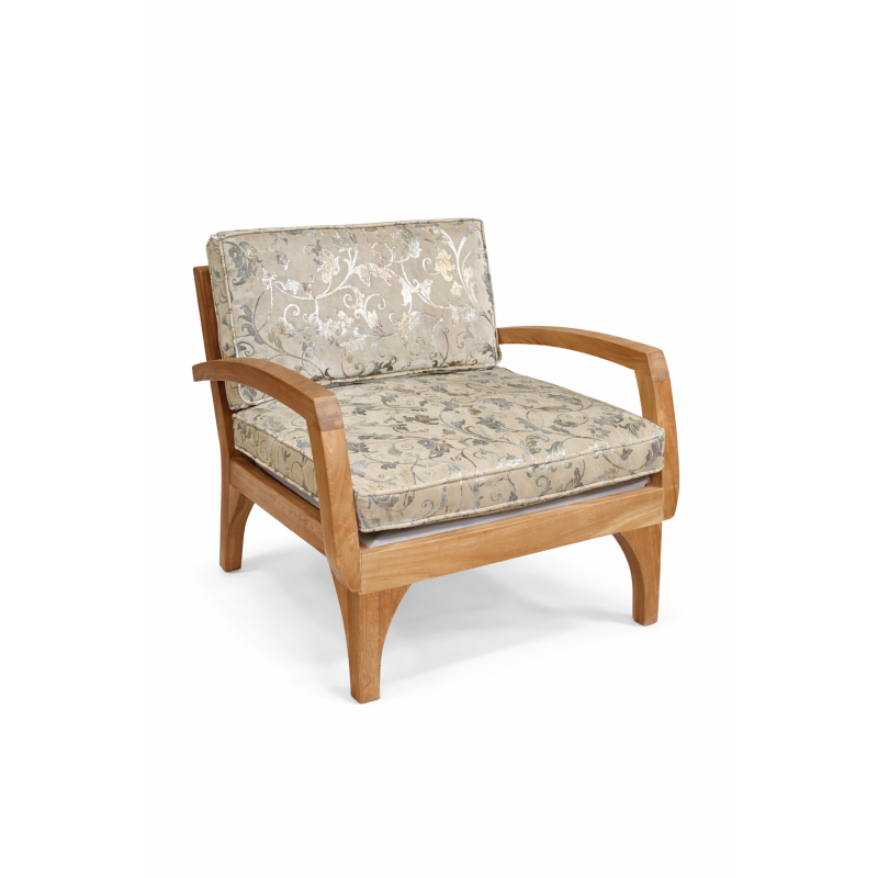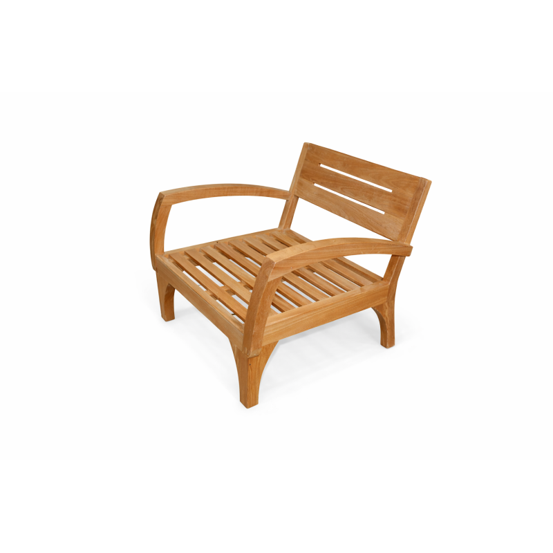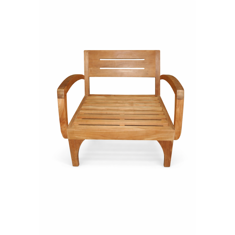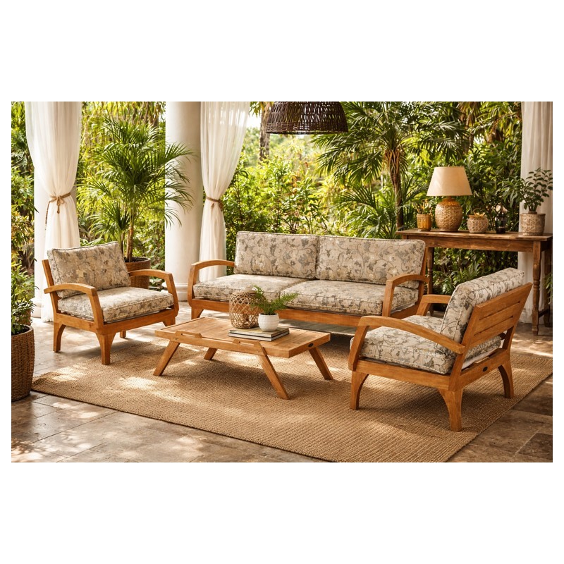 Elegante salotto in teak massello proveniente dall’Indonesia, caratterizzato da linee morbide e design essenziale. Il set è composto da divano 2 posti (L160 x P77 x H80 cm), 2 poltrone (L77 x P77 x H80 cm) e tavolino (L100 x P50 x H35 cm). Completo di cuscini sfoderabili inclusi. Ideale per ambienti interni ed esterni coperti, unisce solidità, comfort e fascino coloniale.
