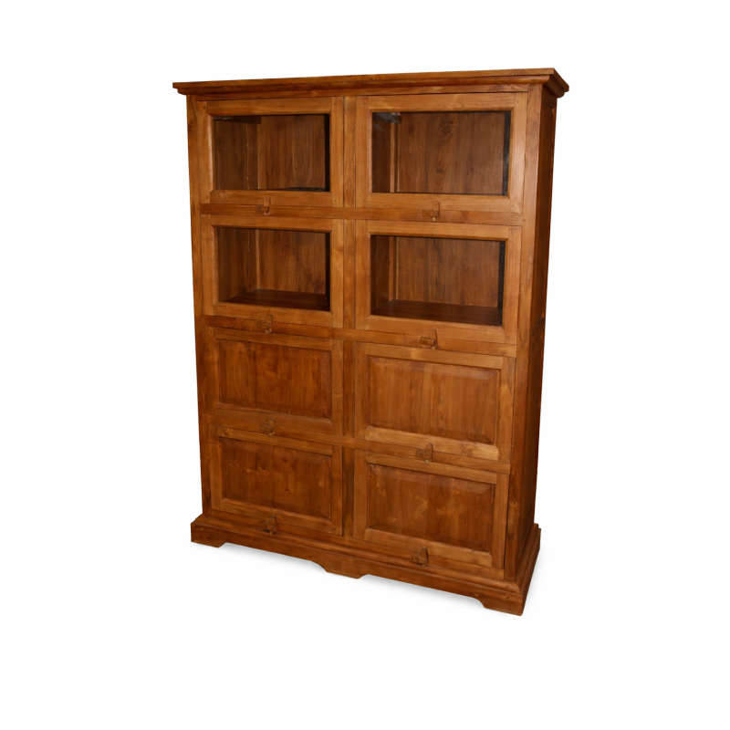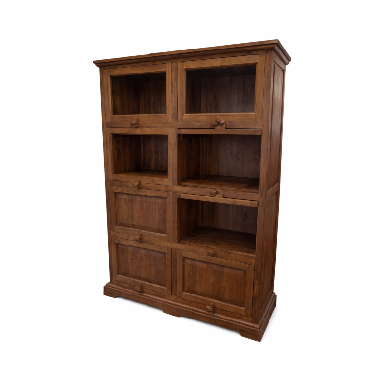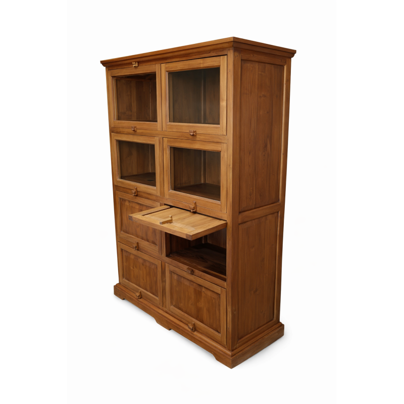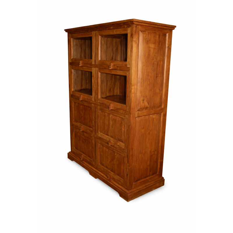 La Dispensa Coloniale Balinese in massello di tek è un mobile solido ed elegante, caratterizzato dall’originale sistema di apertura a scomparsa delle ante. Composta da 4 ante con vetro e 4 ante con pannello pieno, offre 8 vani interni spaziosi (L 52 x P 41 x H 31 cm).