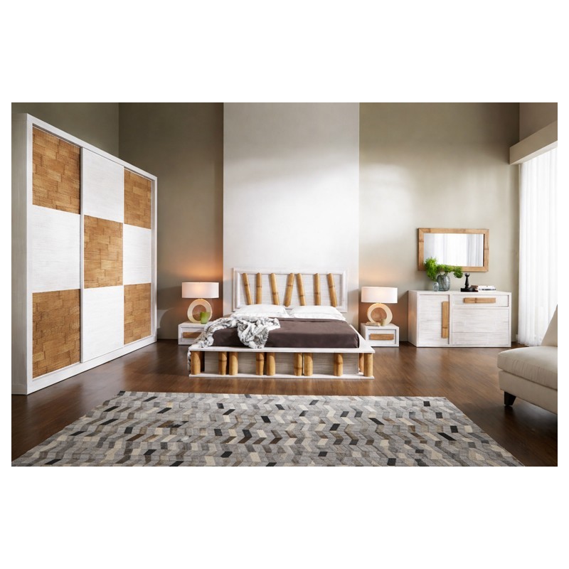 La struttura si presenta nell’elegante finitura decapata bianca, che valorizza la matericità del legno, impreziosita da canne in bambù color miele antico che donano calore e contrasto cromatico. Il risultato è un equilibrio armonioso tra stile naturale, gusto contemporaneo e richiami etnici.