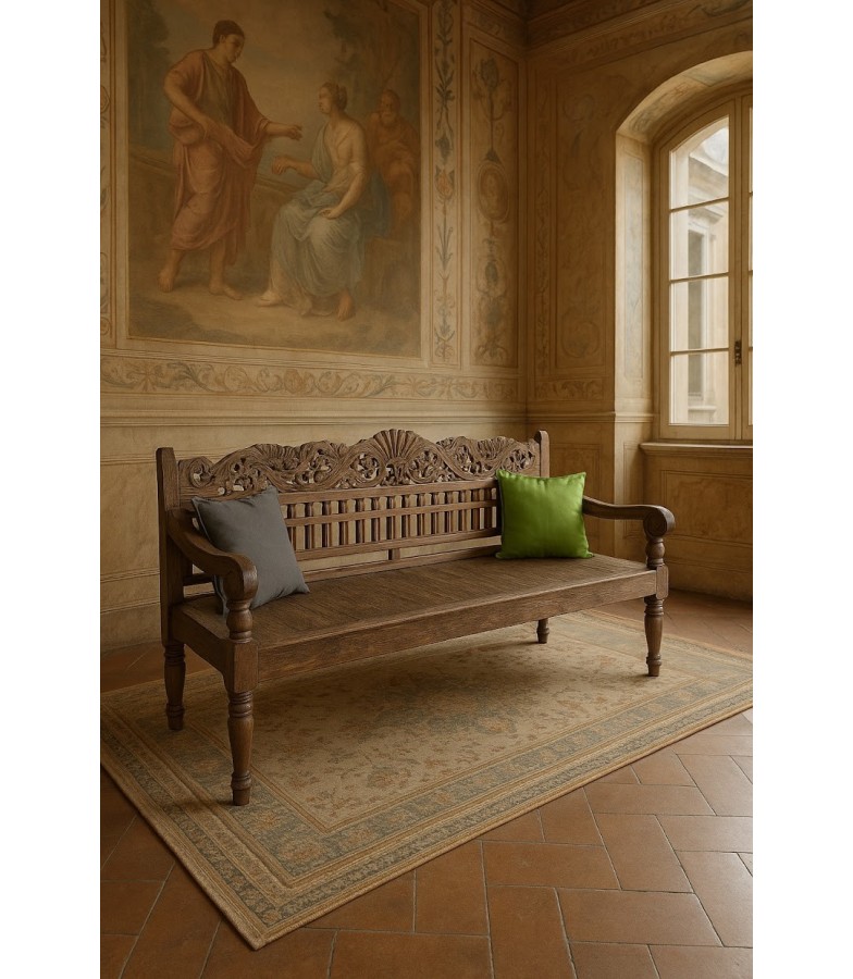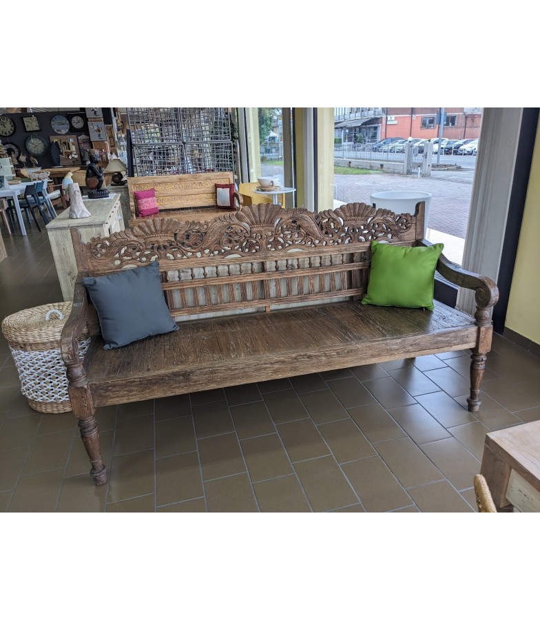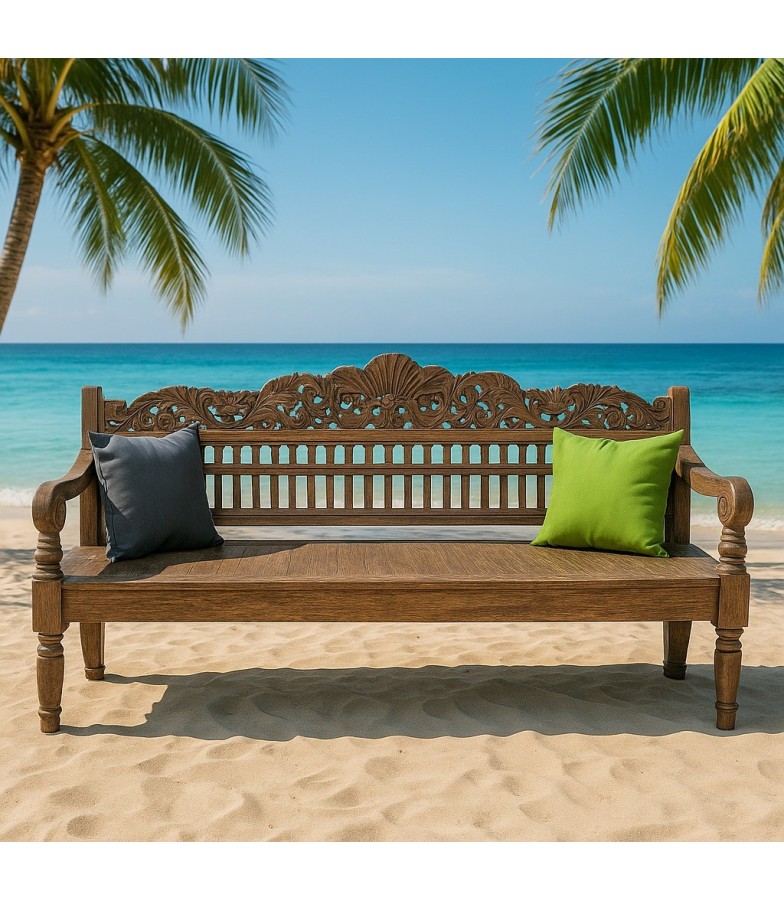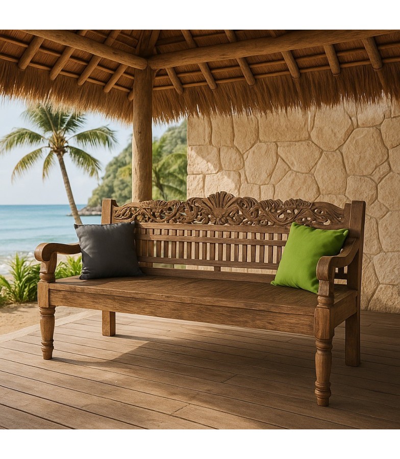 Il design è solido e armonioso, caratterizzato da linee naturali e da intagli decorativi sullo schienale che richiamano la tradizione indonesiana. Le venature del legno, lasciate volutamente a vista, rendono ogni panca diversa dall’altra, con sfumature e dettagli che raccontano il passato del teak.