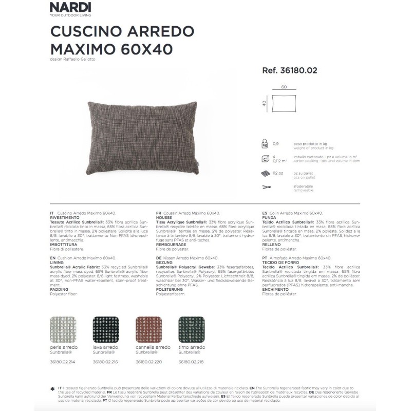 Cuscino arredo Maximo 60 x 40 è un complemento tessile firmato Nardi Outdoor, ideale per valorizzare le sedute della collezione Maximo con un ulteriore livello di comfort e cura estetica.