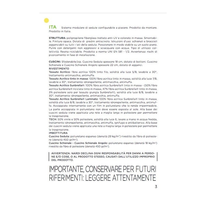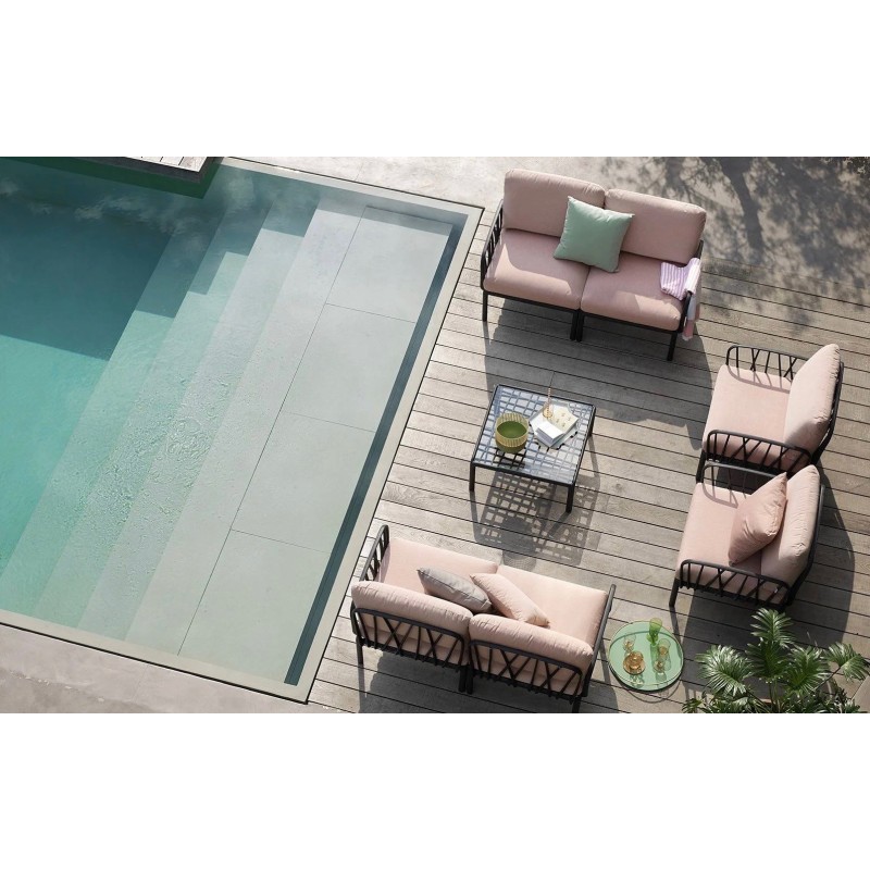 La poltrona è completata da cuscini generosi, progettati per offrire una seduta accogliente. È disponibile con otto varianti di rivestimento, ciascuna con caratteristiche tecniche specifiche per l’utilizzo outdoor: