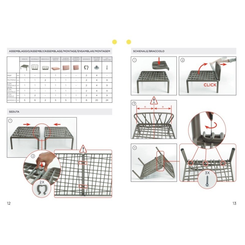 Il set è composto da 5 sedute complete di cuscini sfoderabili per seduta e schienale, 2 braccioli e 6 schienali, elementi che permettono di creare una struttura accogliente e ben organizzata, ideale per momenti di relax e convivialità.