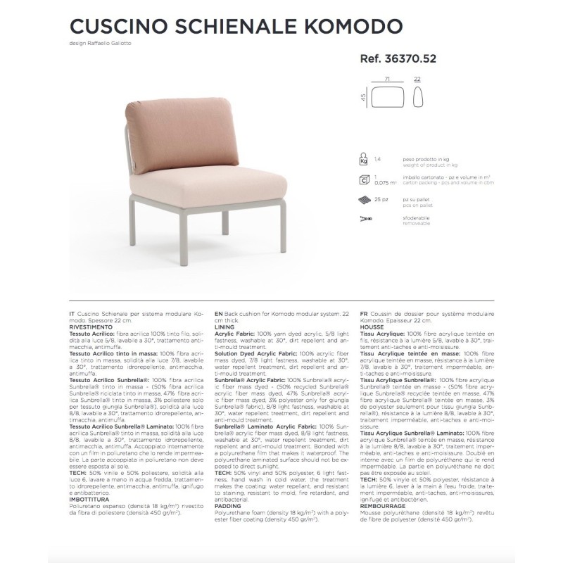 Cuscino imbottito specifico per lo schienale lineare del sistema Komodo. Sfoderabile e bordato. Dimensioni: 71x22 cm Altezza: 45 cm Peso: 1,4 kg Pz. 1