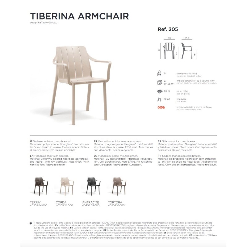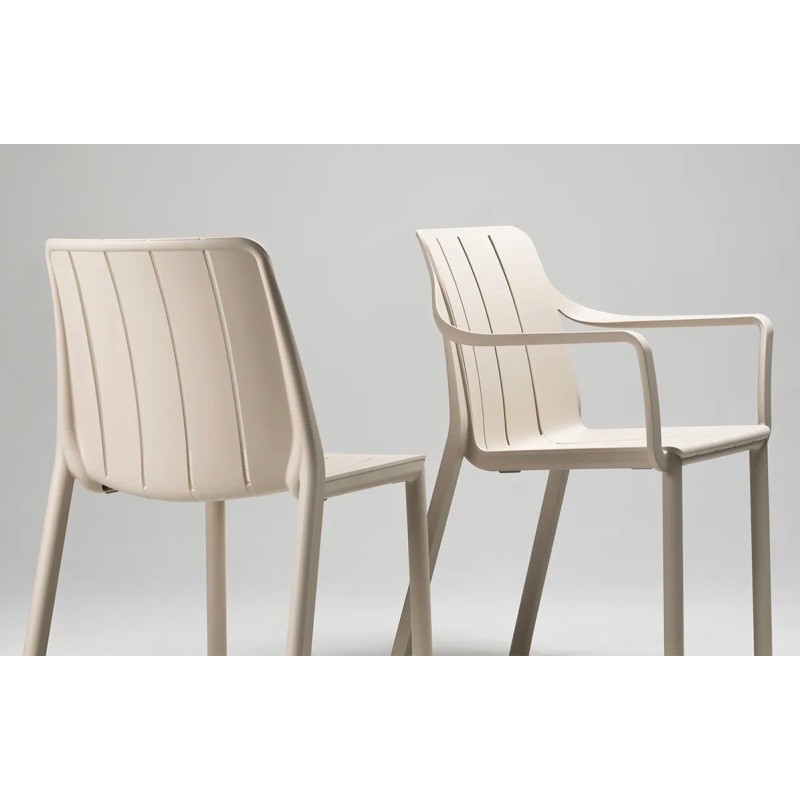 Realizzata in polipropilene fiberglass trattato anti UV e colorato in massa, presenta una finitura opaca e una struttura resistente agli agenti atmosferici, progettata per garantire durata e praticità nel tempo. La resina è completamente riciclabile e una delle varianti è realizzata in materiale rigenerato (terra), a conferma dell’attenzione alla sostenibilità. I piedini antiscivolo assicurano una buona stabilità su varie superfici. Nella versione colore Terra la sedia è in polipropilene fiberglass rigenerato e può presentare delle variazioni di colore dovute all'utilizzo di materiale riciclato.
