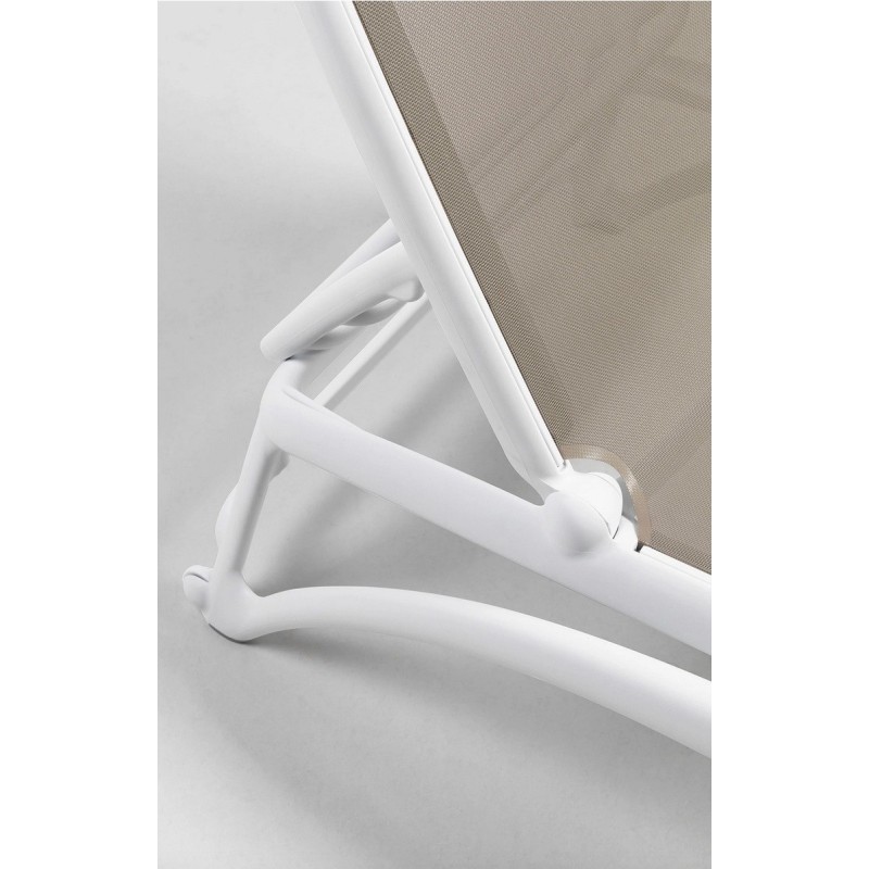 Il piano di appoggio è costituito da un tessuto sintetico traspirante e sostituibile, studiato per favorire la ventilazione e garantire una sensazione di comfort anche nelle giornate più calde. Lo schienale reclinabile in più posizioni permette di personalizzare l’inclinazione in base alle esigenze, rendendo il lettino adatto sia al relax che alla lettura.