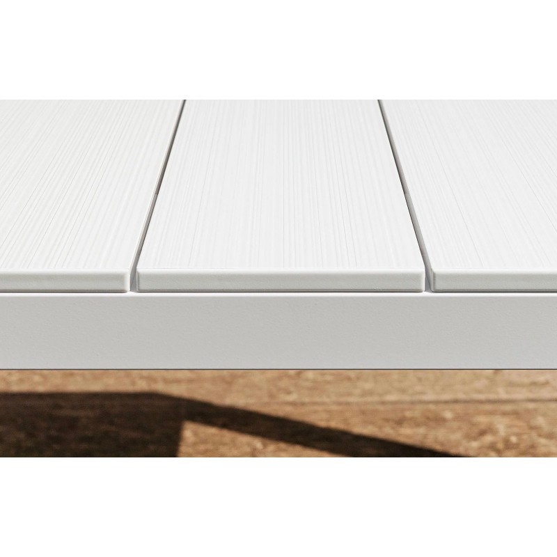 Il piano, caratterizzato da un disegno a doghe lineari, conferisce al tavolo un’estetica pulita e moderna, facilmente abbinabile a diverse tipologie di sedute outdoor, sia in contesti residenziali che contract.