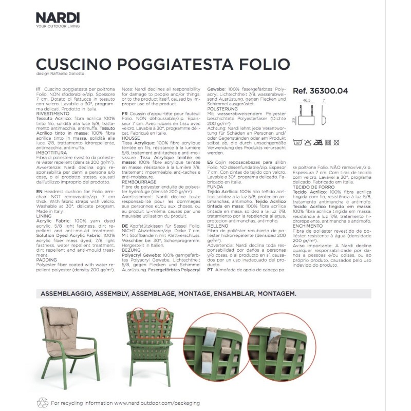Cuscino poggiatesta Folio è un accessorio tessile firmato Nardi Outdoor, progettato per completare la poltrona Folio offrendo un supporto mirato alla zona cervicale e aumentando il comfort durante il relax.