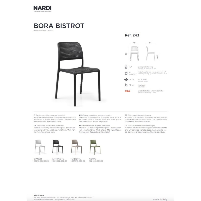 La sedia Bora Bistrot prodotta da Nardi Outdoor è una seduta monoscocca senza braccioli dal design moderno ed essenziale, progettata per offrire comfort, resistenza e praticità negli ambienti outdoor e negli spazi professionali. La sua linea semplice e contemporanea la rende adatta a diversi contesti di arredo, come giardini, terrazze, bar, ristoranti e locali pubblici.
