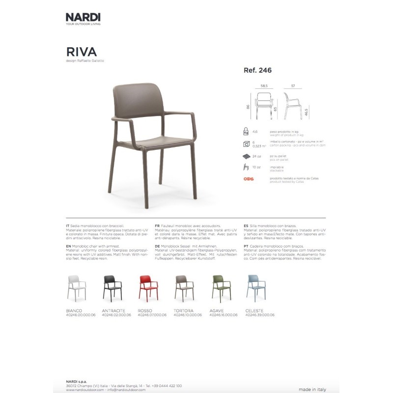 Grazie alla qualità dei materiali, al design contemporaneo e alla praticità di utilizzo, la sedia Riva rappresenta una soluzione ideale per arredare con stile e funzionalità spazi esterni domestici e ambienti professionali come bar, ristoranti e strutture ricettive.