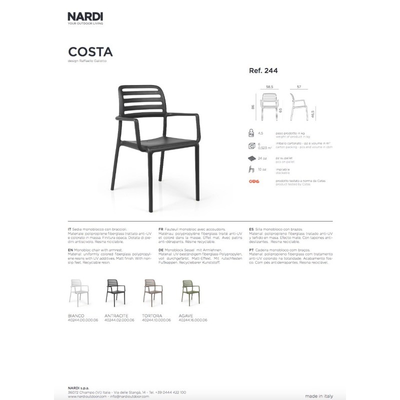 La sedia con braccioli modello Costa prodotta da Nardi Outdoor è una seduta monoblocco progettata dal designer Raffaello Galiotto, pensata per l’arredo di spazi esterni come giardini, terrazze, verande, bar e ristoranti, ma utilizzabile anche in ambienti interni grazie al suo design essenziale e contemporaneo. La sedia si distingue per linee semplici e funzionali che coniugano estetica moderna, comfort e praticità d’uso.