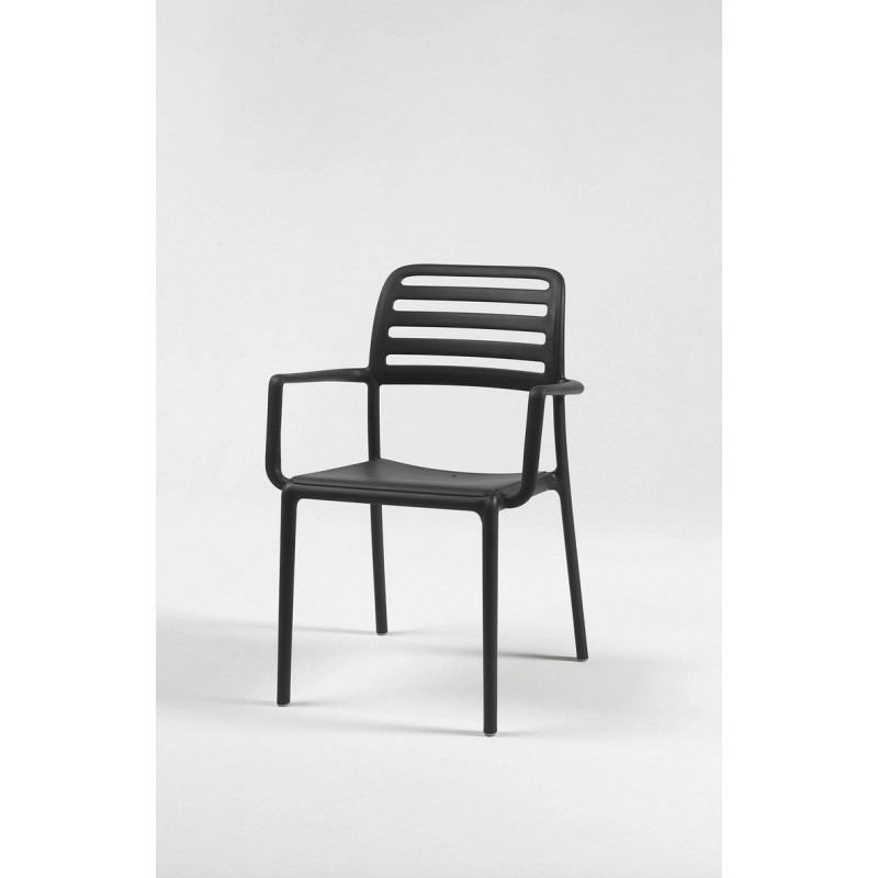 sedia Costa, seduta monoscocca con braccioli. Caratterizzata da un design essenziale con doghe orizzontali. Realizzata in resina di prima qualità con fibra di vetro trattata anti-UV. Dimensioni: L58,5 x P 57 x H 86 cm, Peso: 4,5 kg, Pz. 6 per cartone, Impilabile fino: pz. 10