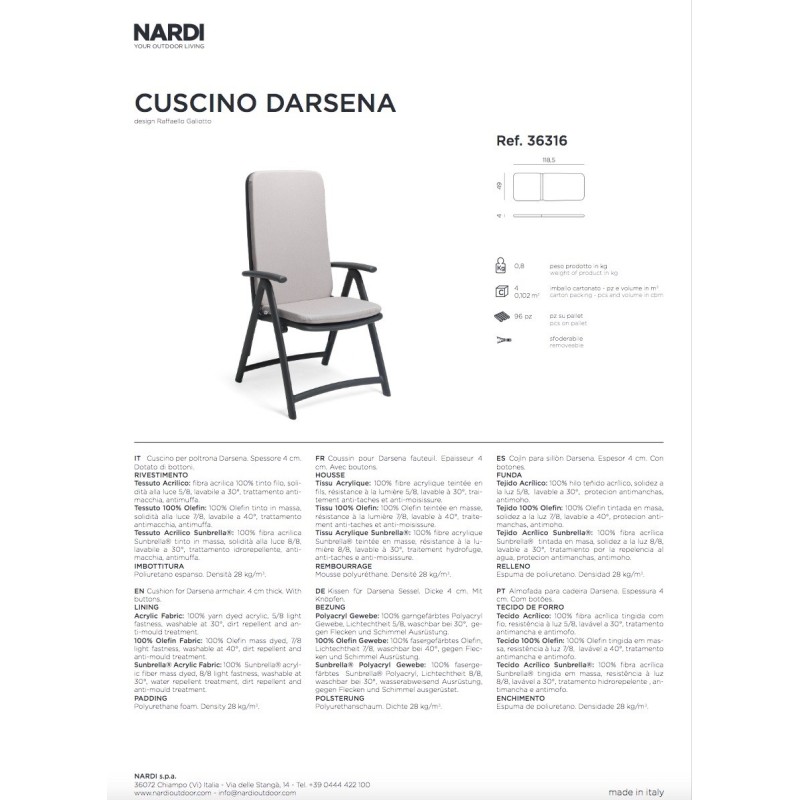 Il cuscino per poltrona Darsena, prodotto da Nardi S.p.A., è un accessorio progettato per aumentare il comfort della poltrona reclinabile Darsena e per migliorarne l’ergonomia durante l’utilizzo in ambienti esterni come giardini, terrazze, bordi piscina e spazi contract. Il design segue perfettamente la forma della seduta e dello schienale della poltrona, offrendo un appoggio uniforme e confortevole.