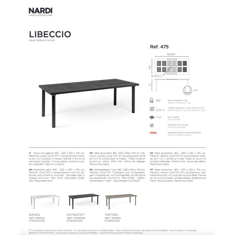 Il tavolo Libeccio di Nardi Outdoor è un tavolo da esterno allungabile progettato per unire funzionalità, resistenza e design elegante. Realizzato con piano in resina fiberglass DurelTOP trattata anti-UV e dotato di robuste gambe in alluminio verniciato, garantisce stabilità e durata nel tempo anche in ambienti esterni esposti agli agenti atmosferici.