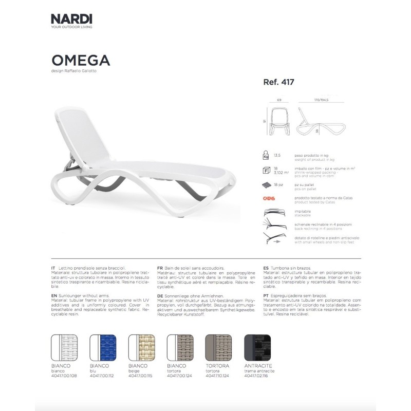 Lettino prendisole senza braccioli  modello Omega con schienale regolabile in 4 posizioni. Struttura tubolare in resina e tessuto sintetico traspirante e ricambiabile. Design ergonomico e impilabile. Tessuto ricambiabile. Dimensioni: 69x170/194,5 cm Altezza: 91 cm Peso: 13,5 kg Pz. 18 Impilabile fino: pz. 14