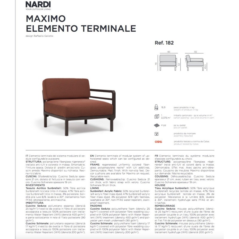 Maximo elemento terminale è un modulo da esterno firmato Nardi Outdoor, progettato per completare composizioni modulari con eleganza e funzionalità, oppure per essere utilizzato come seduta indipendente in ambienti outdoor contemporanei.