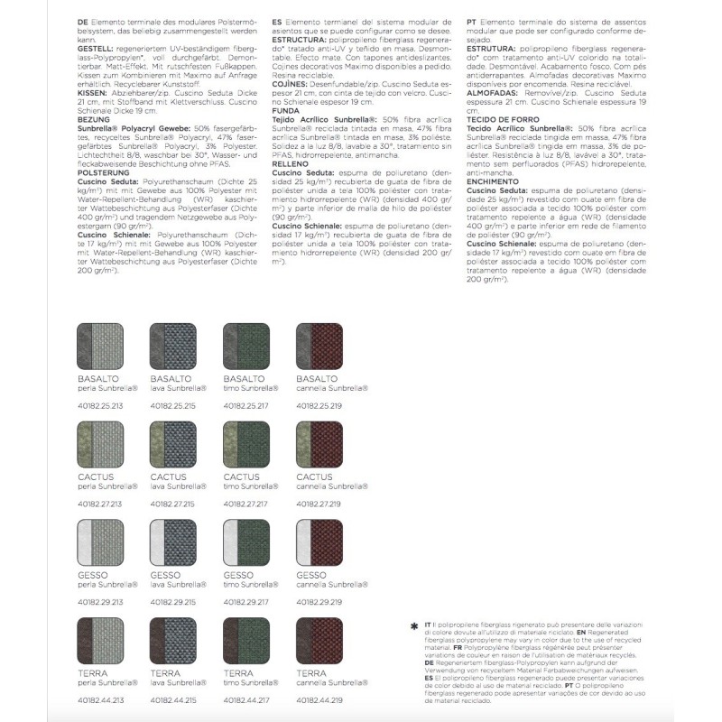 La struttura è realizzata in polipropilene fiberglass rigenerato, un materiale resistente, durevole e riciclabile, ideale per affrontare agenti atmosferici e utilizzo quotidiano. È proposta in quattro tonalità naturali e versatili: Terra, Gesso, Cactus e Basalto, pensate per integrarsi armoniosamente in qualsiasi contesto esterno.